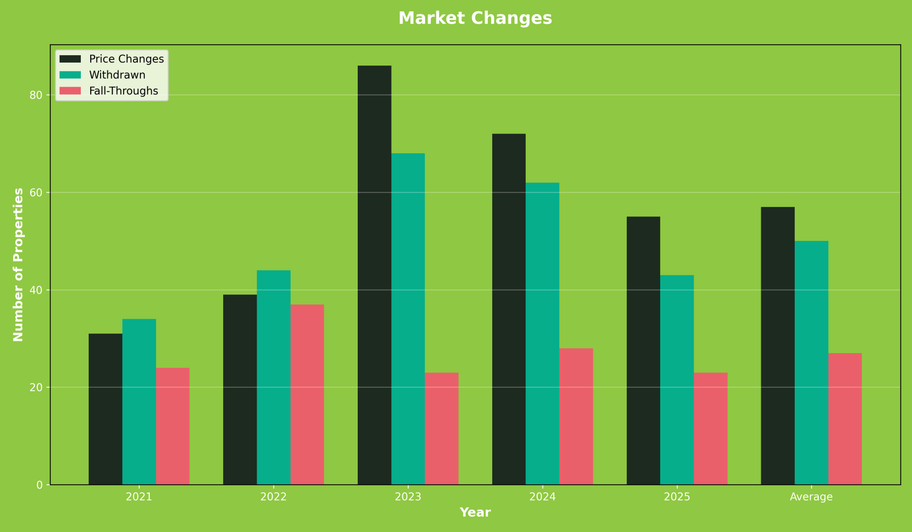 Fall throughs declined by 17.9% to reach 23 collapsed transactions, running 15% below the five year average. This improvement, while more modest than the changes and withdrawals declines, demonstrates that transactions reaching agreement stage increasingly proceed to completion. Survey findings, mortgage valuations and chain complications still cause some collapses, yet the 23 fall throughs against 132 sales agreed represents a collapse rate around 17%, substantially better than the elevated levels of previous years.