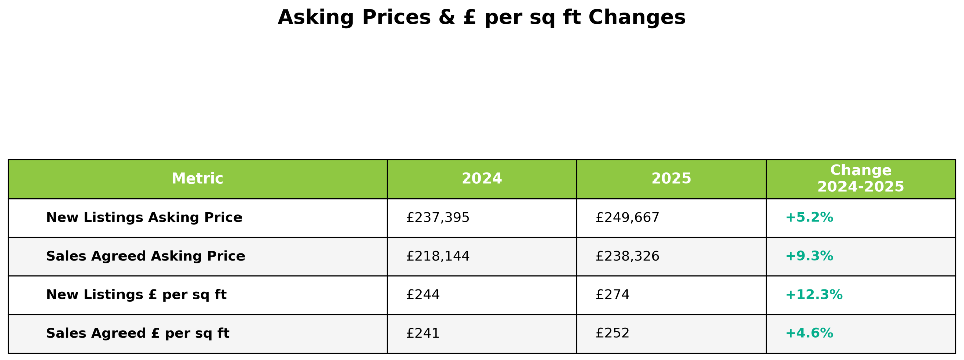 The price per square foot metrics reveal even more impressive dynamics. New listings averaged £274 per square foot, up 12.3% from 2024's £244, the strongest growth metric across the entire dataset. Sales agreed achieved £252 per square foot, up 4.6% year on year. This substantial growth in per square foot pricing demonstrates that Cadishead properties are genuinely appreciating in value on a per unit area basis, reflecting the area's growing appeal and the quality of stock available.